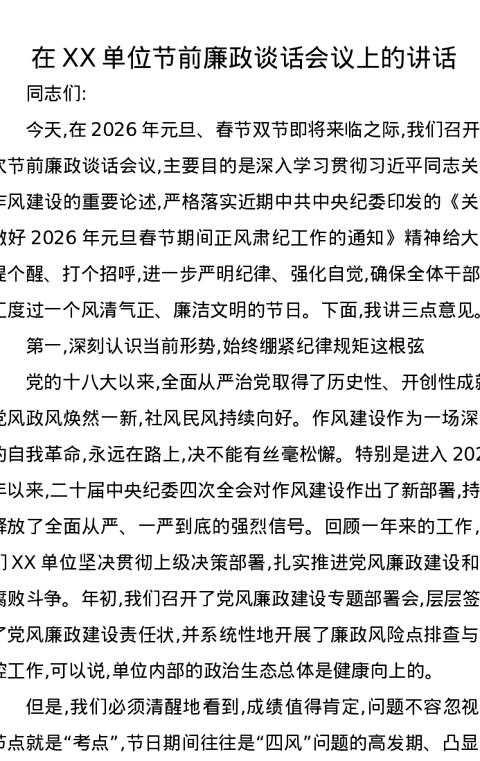 在XX单位节前廉政谈话会议上的讲话