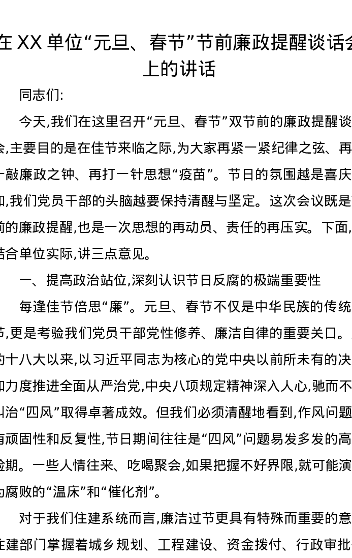 在XX单位元旦、春节节前廉政提醒谈话会上的讲话