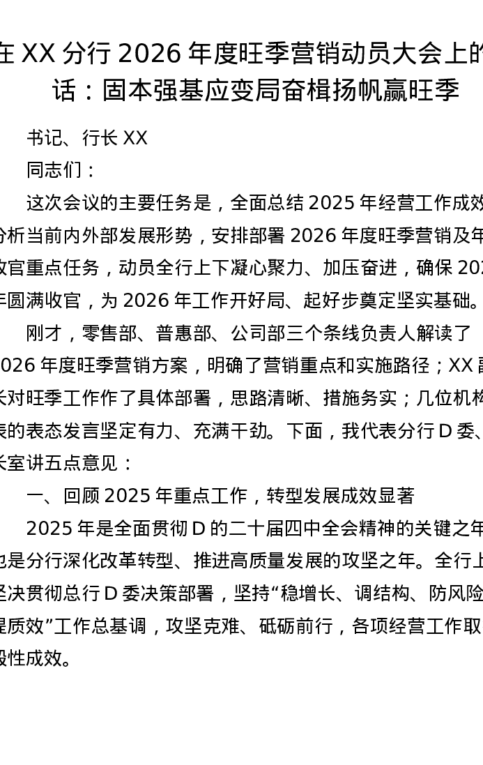 在XX分行2026年度旺季营销动员大会上的讲话:固本强基应变局 奋楫扬帆赢旺季