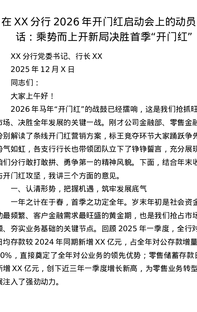 在XX分行2026年开门红启动会上的动员讲话:乘势而上开新局 决胜首季开门红