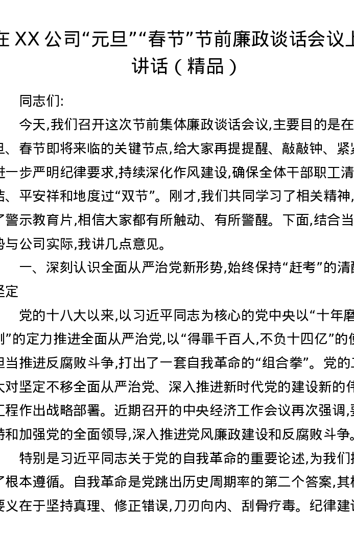 在XX公司元旦春节节前廉政谈话会议上的讲话