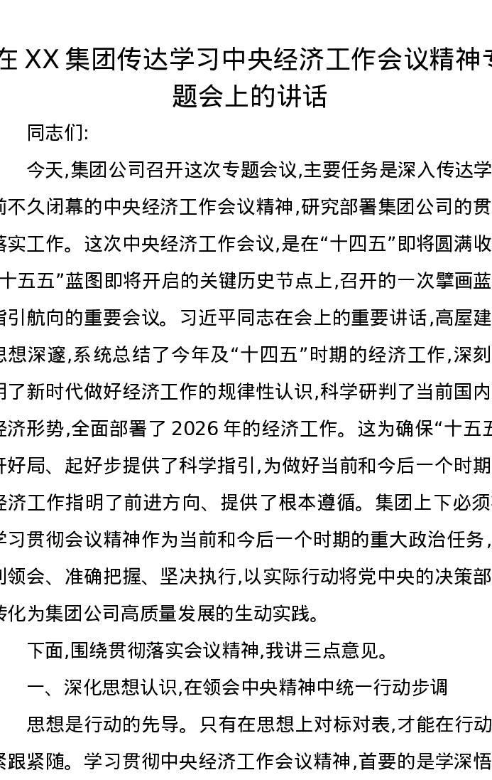 在XX集团传达学习中央经济工作会议精神专题会上的讲话