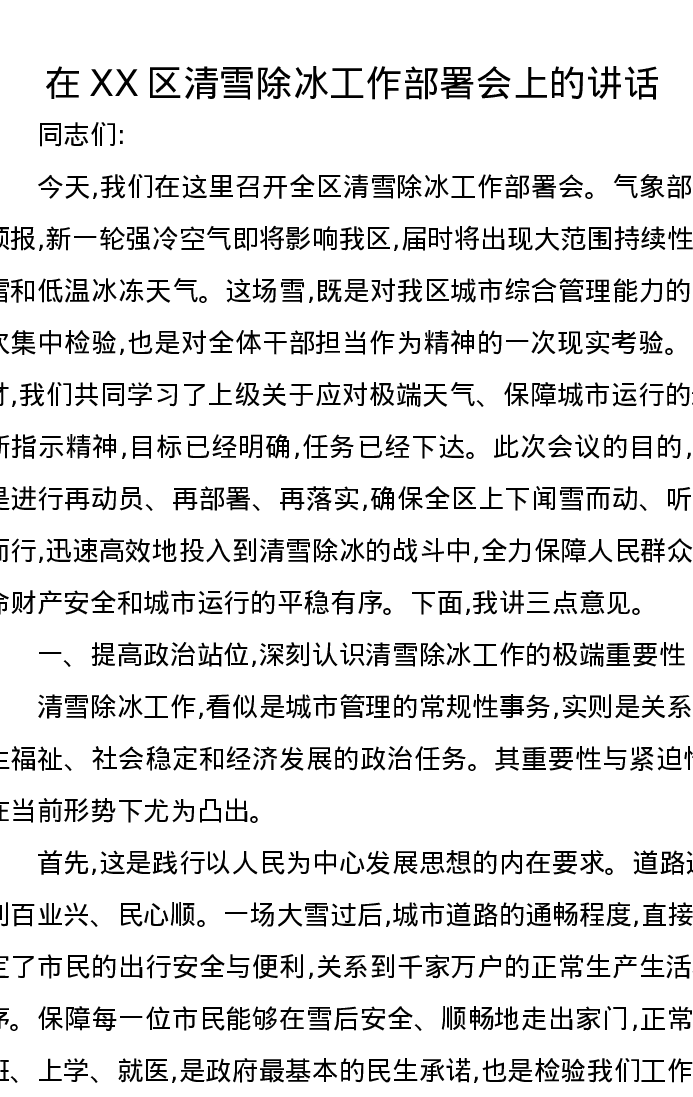 在XX区清雪除冰工作部署会上的讲话2