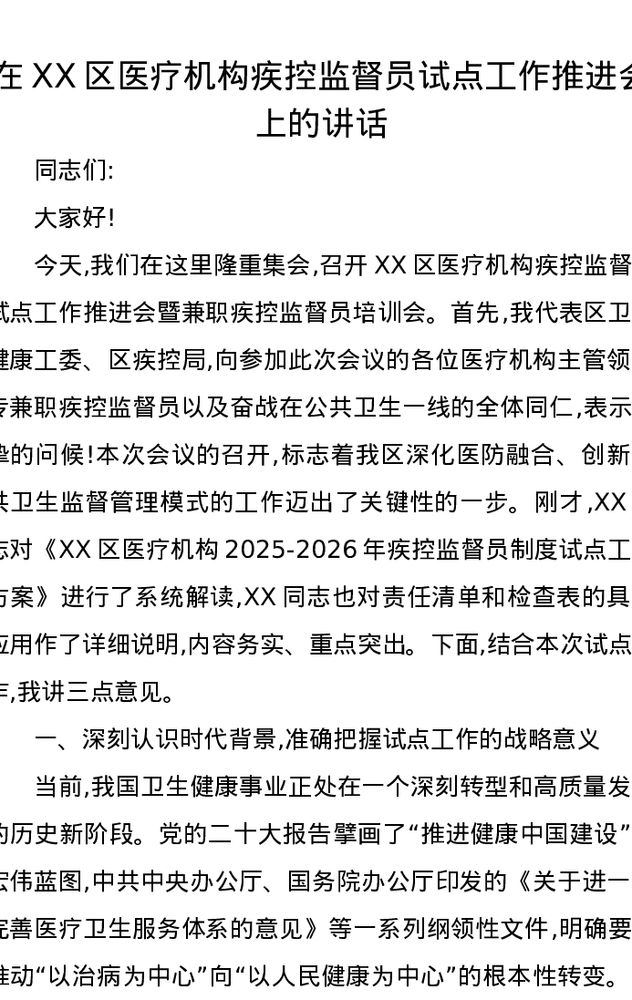 在XX区医疗机构疾控监督员试点工作推进会上的讲话