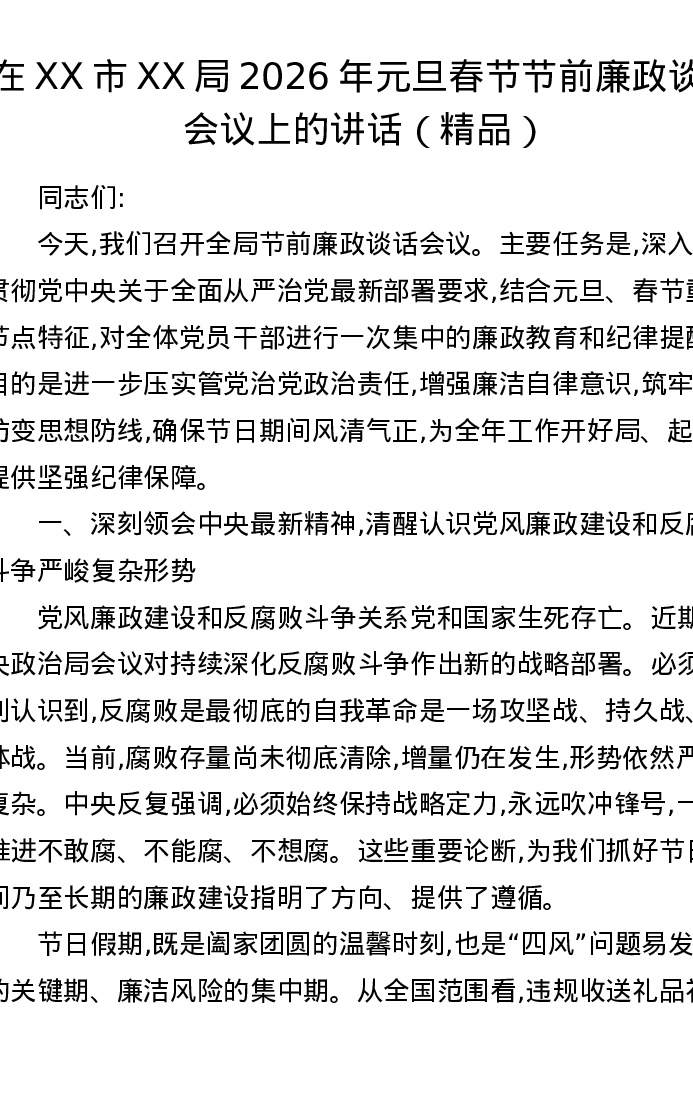 在XX市XX局2026年元旦春节节前廉政谈话会议上的讲话