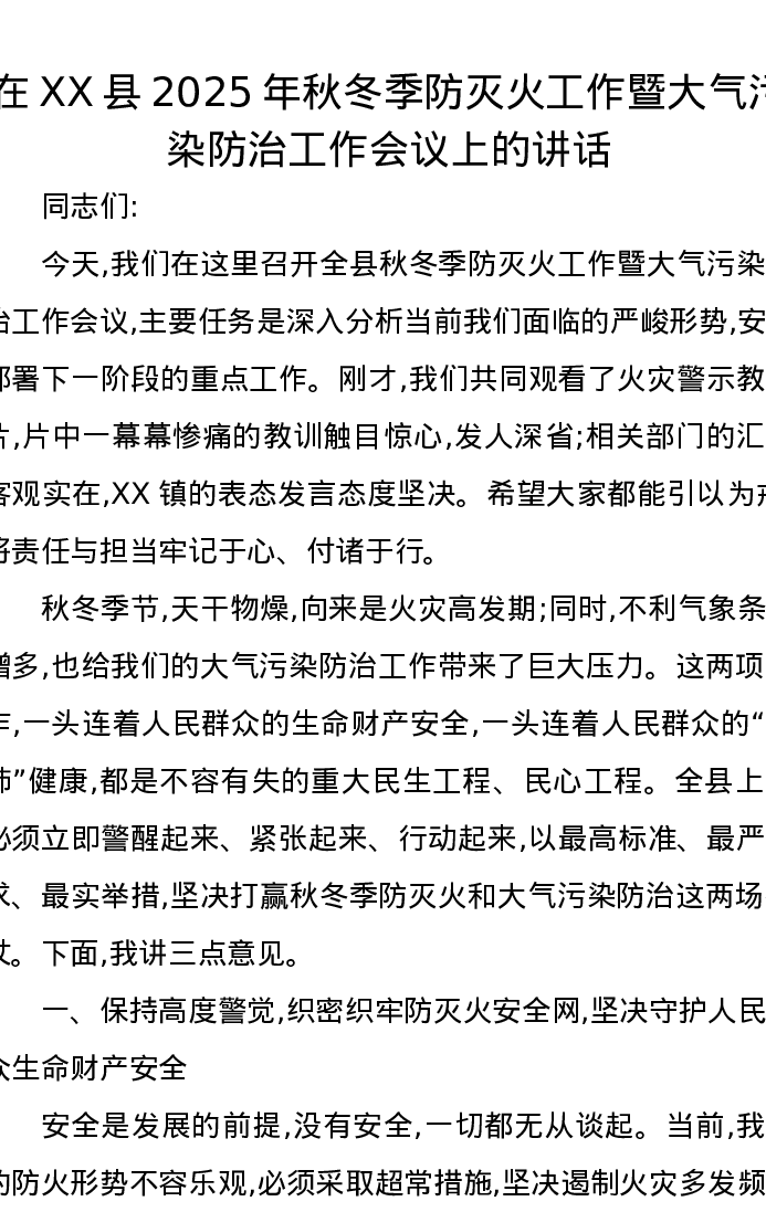 在XX县2025年秋冬季防灭火工作暨大气污染防治工作会议上的讲话
