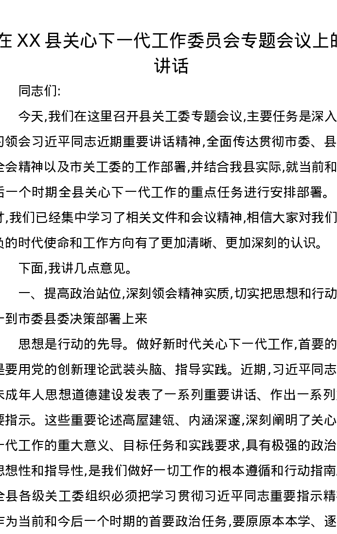 在XX县关心下一代工作委员会专题会议上的讲话