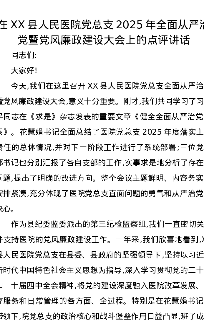 在XX县人民医院党总支2025年全面从严治党暨党风廉政建设大会上的点评讲话
