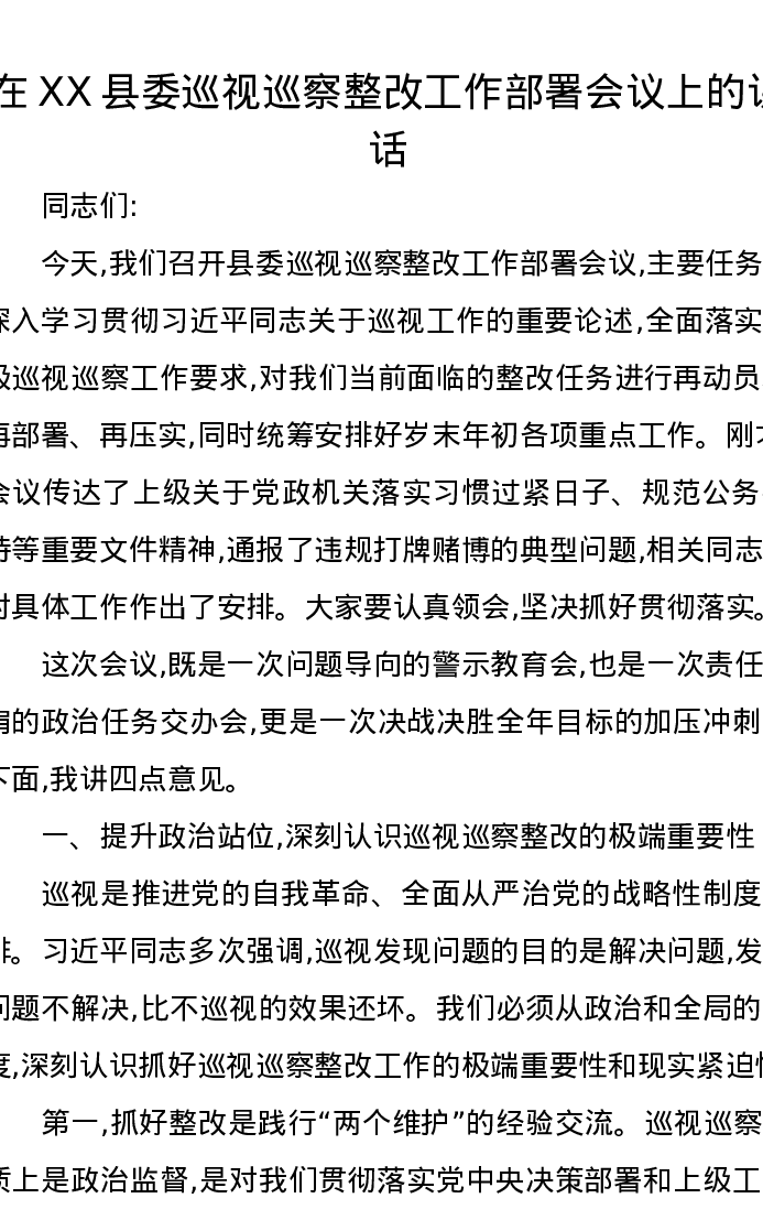 在XX县委巡视巡察整改工作部署会议上的讲话