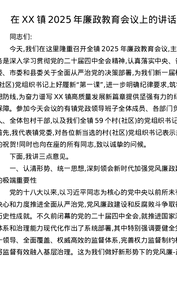 在XX镇2025年廉政教育会议上的讲话
