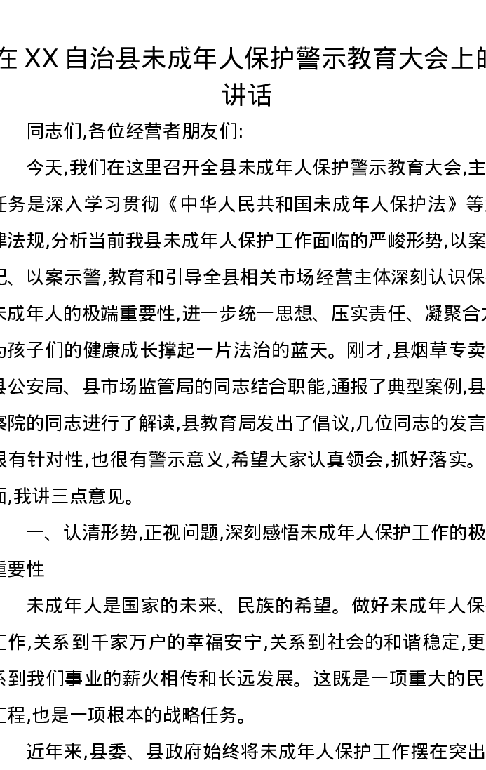 在XX自治县未成年人保护警示教育大会上的讲话