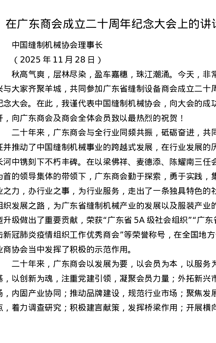 在广东商会成立二十周年纪念大会上的讲话