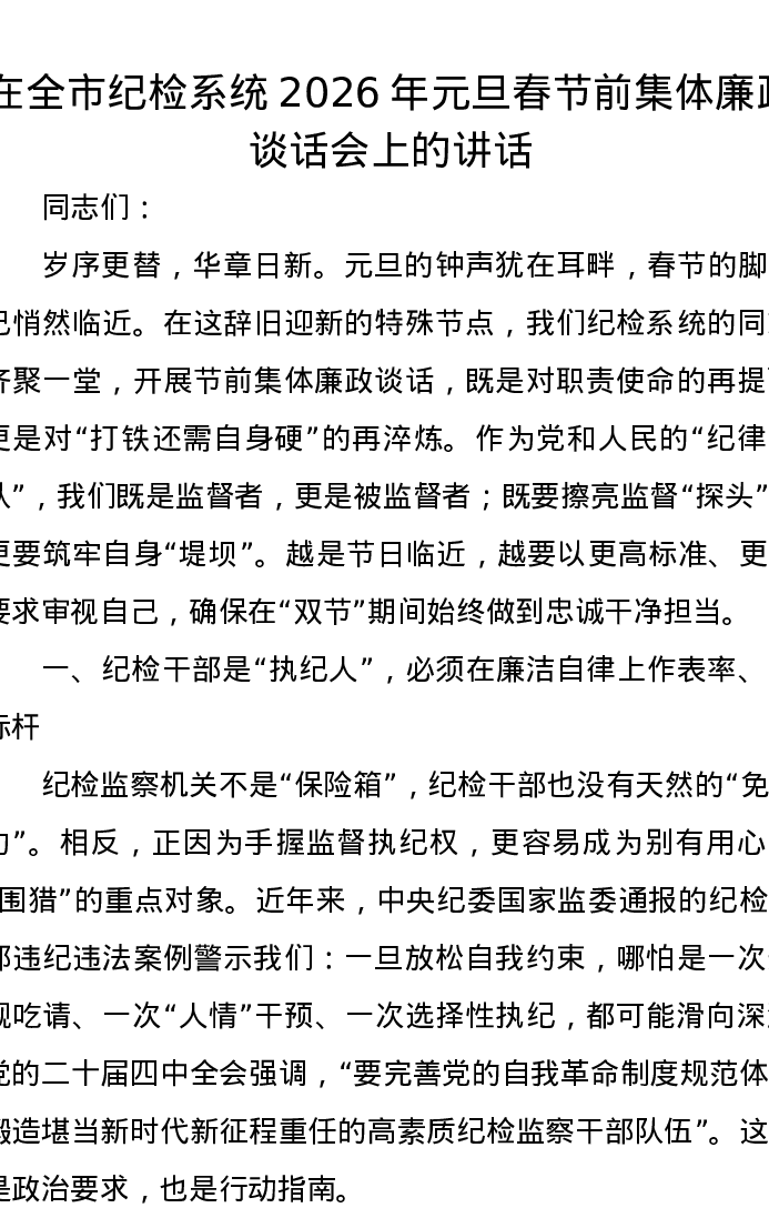 在全市纪检系统2026年元旦春节前集体廉政谈话会上的讲话