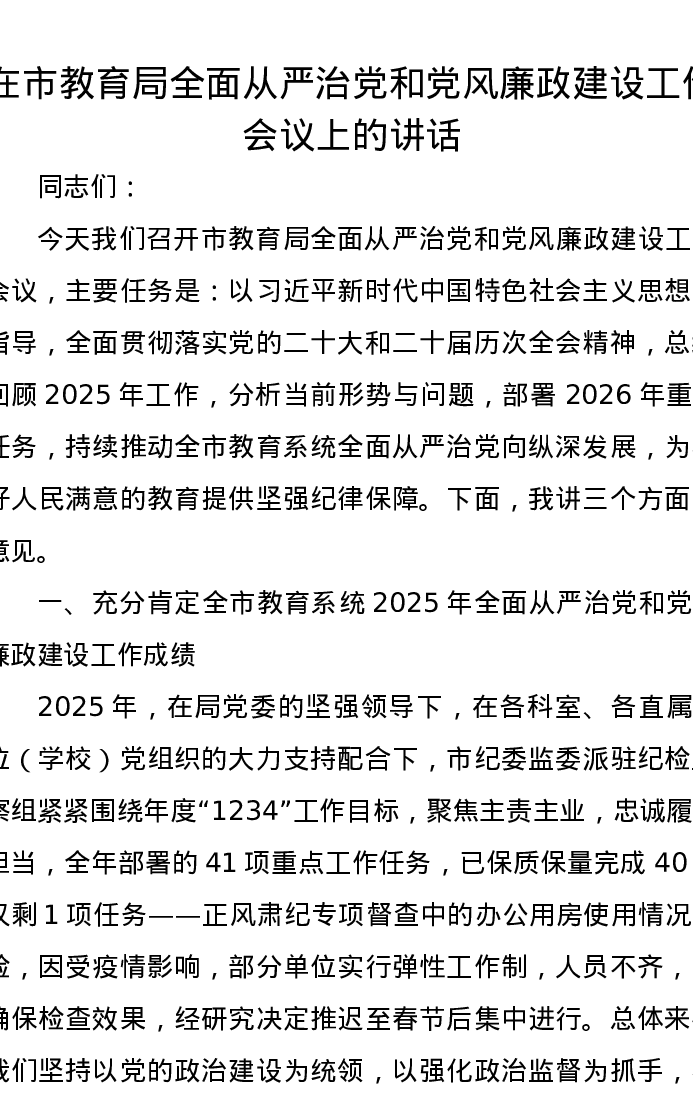 在市教育局全面从严治党和党风廉政建设工作会议上的讲话