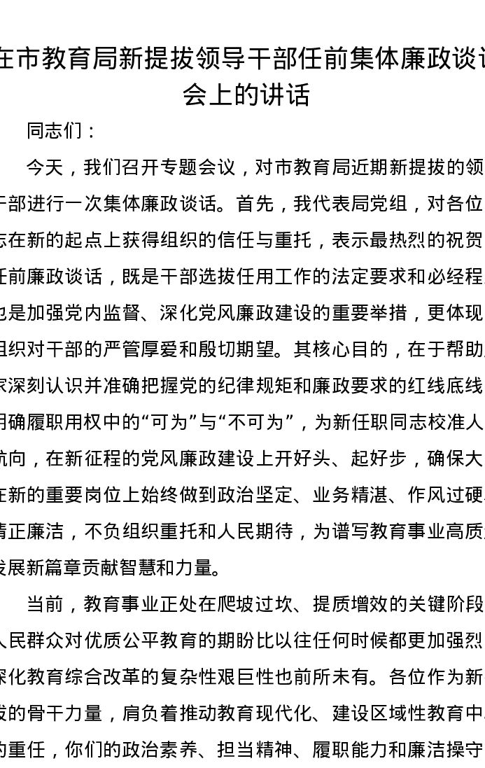 在市教育局新提拔领导干部任前集体廉政谈话会上的讲话
