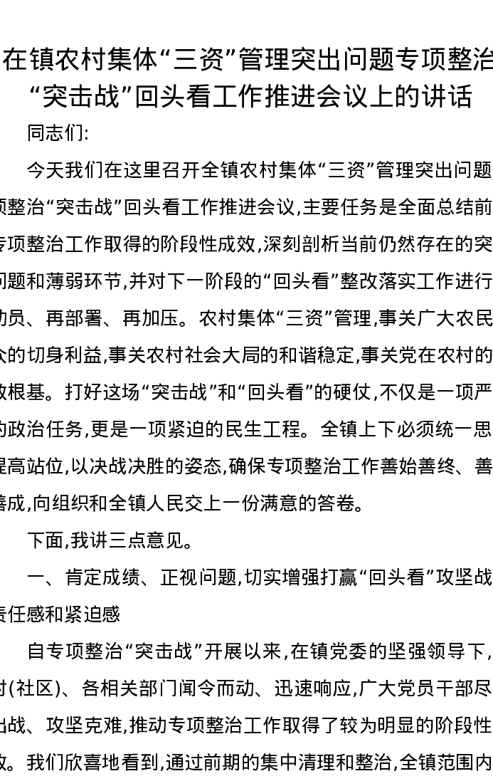 在镇农村集体三资管理突出问题专项整治突击战回头看工作推进会议上的讲话