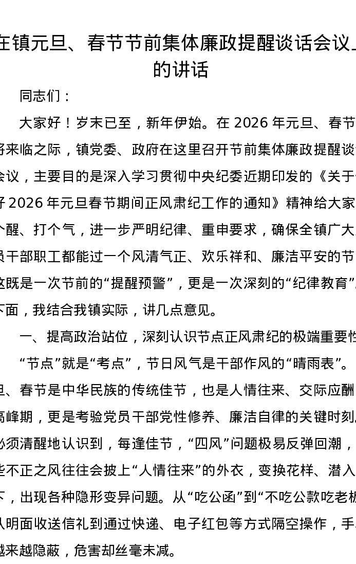 在镇元旦、春节节前集体廉政提醒谈话会议上的讲话