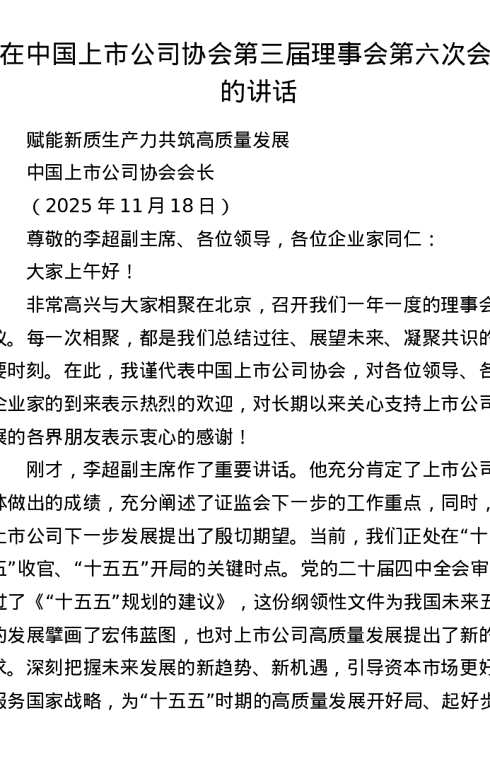 在中国上市公司协会第三届理事会第六次会议的讲话