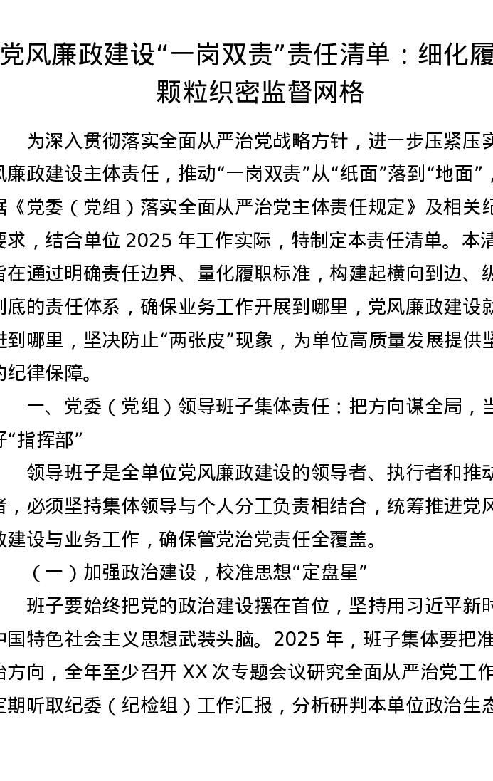 党风廉政建设一岗双责责任清单:细化履职颗粒 织密监督网格