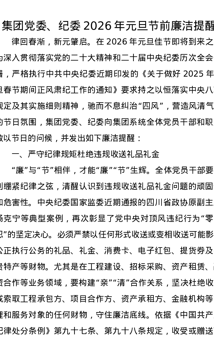 集团党委、纪委2026年元旦节前廉洁提醒