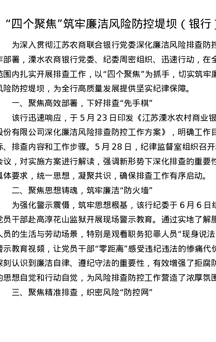 四个聚焦筑牢廉洁风险防控堤坝(银行)