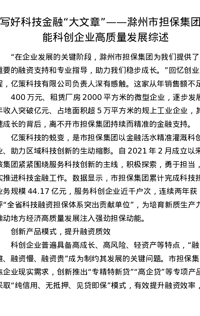 写好科技金融 大文章——滁州市担保集团赋能科创企业高质量发展综述