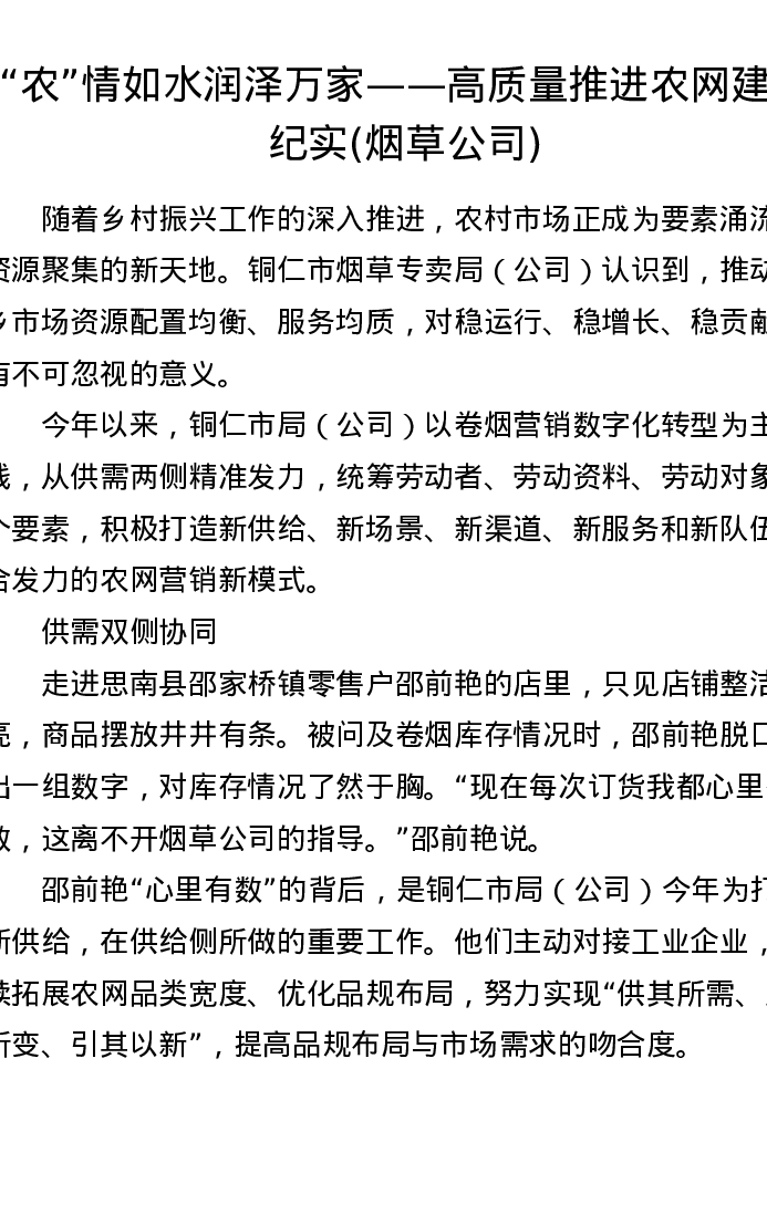 农情如水润泽万家——高质量推进农网建设纪实(烟草公司)