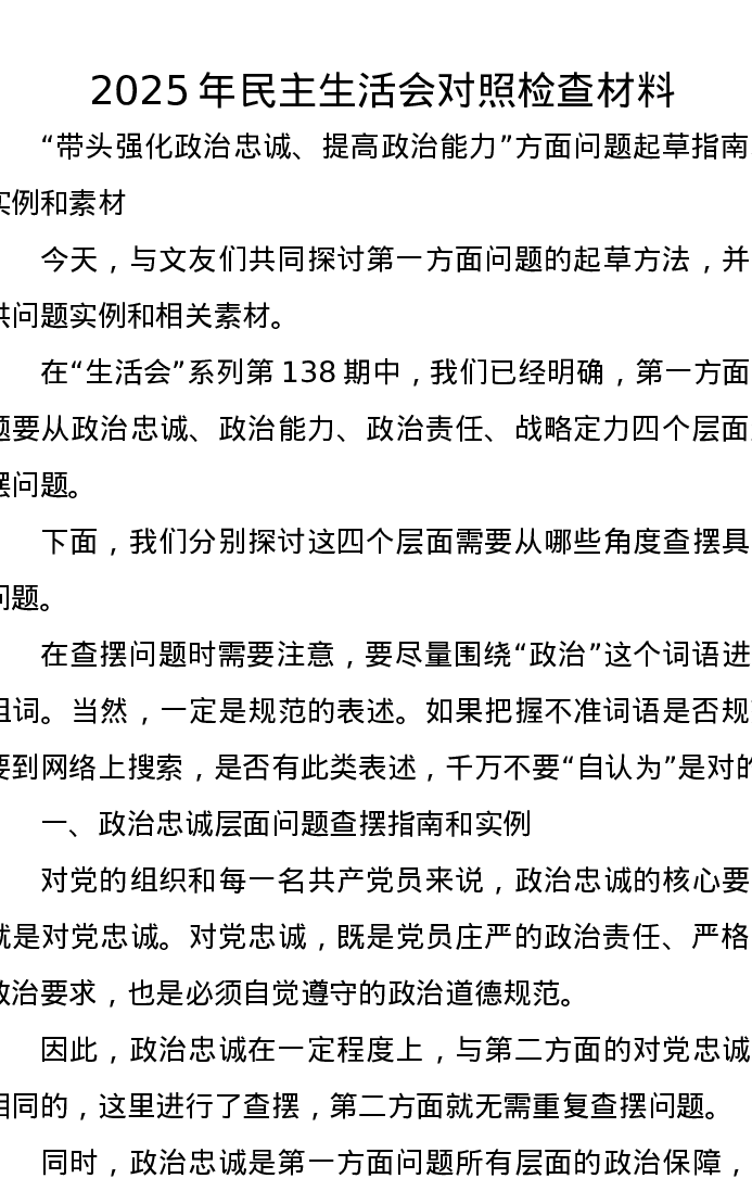 (138条)2025年xxxxx对照检查材料带头强化政治忠诚、提高政治能力方面问题起草指南、实例和素材