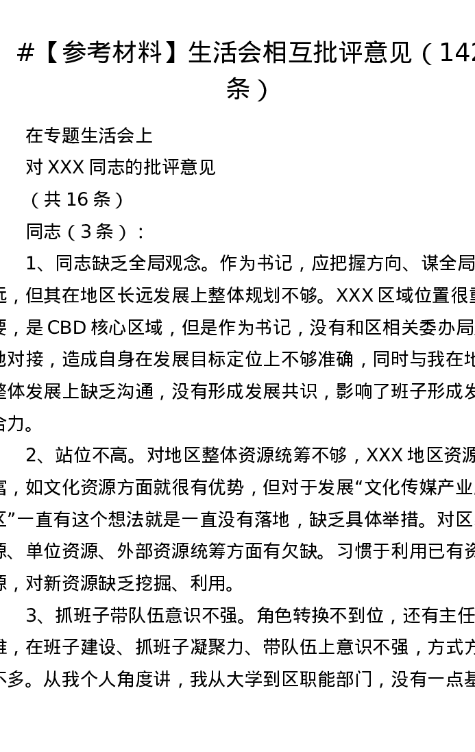 【参考材料】2025年xxxxx相互批评意见(142条)