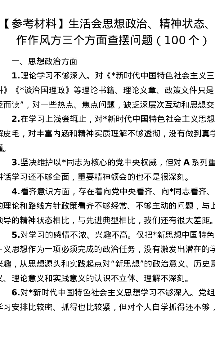 【参考材料】生活会思想政治、精神状态、工作作风方三个方面查摆问题(100个)