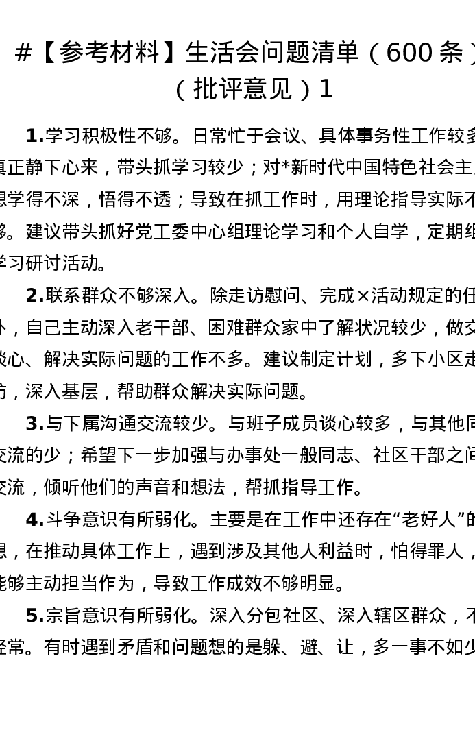 【参考材料】生活会问题清单(600条)(批评意见)1