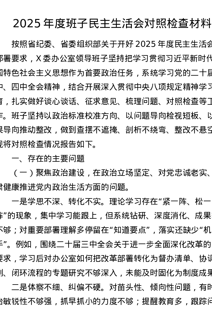 2025年度班子xxxxx对照检查材料(五个带头)(4383字)