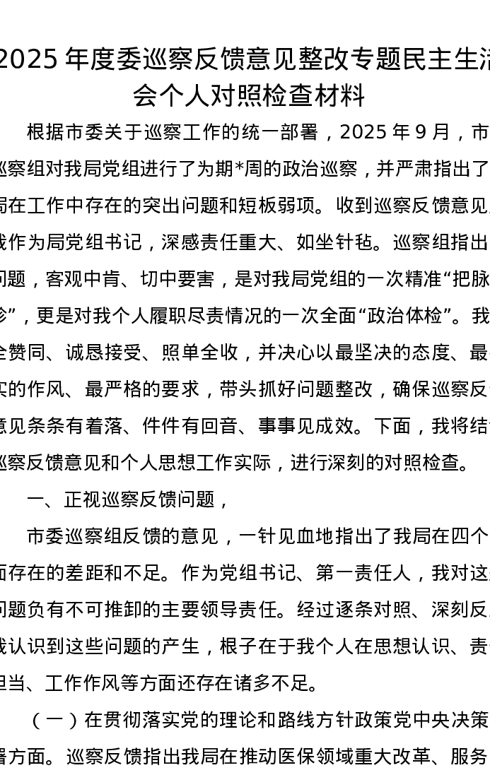 2025年度委巡察反馈意见整改专题xxxxx个人对照检查材料