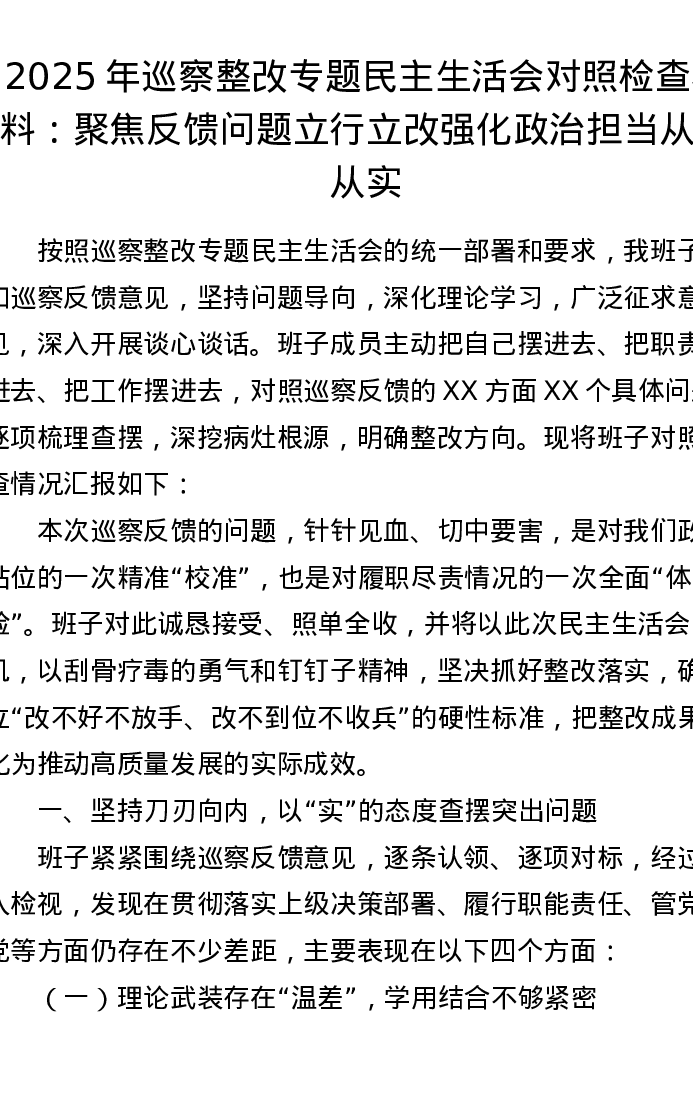 2025年巡察整改专题xxxxx对照检查材料:聚焦反馈问题立行立改 强化政治担当从严从实