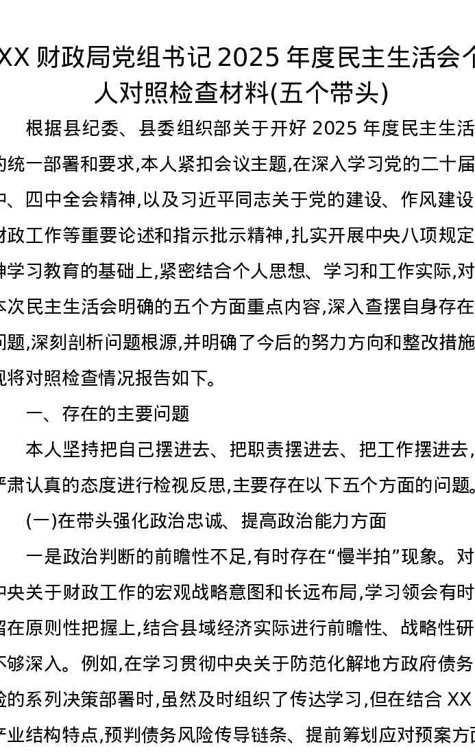 XX财政局党组书记2025年度xxxxx个人对照检查材料(五个带头)