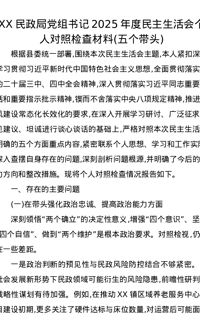 XX民政局党组书记2025年度xxxxx个人对照检查材料(五个带头)