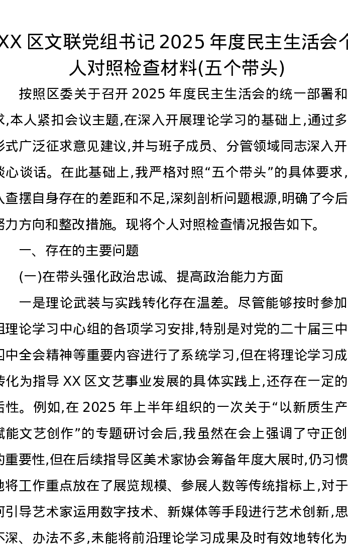 XX区文联党组书记2025年度xxxxx个人对照检查材料(五个带头)