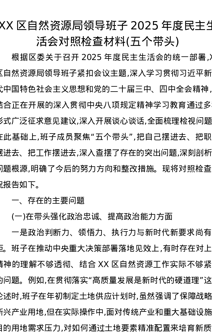 XX区自然资源局领导班子2025年度xxxxx对照检查材料(五个带头)