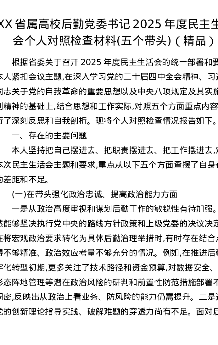 XX省属高校后勤党委书记2025年度xxxxx个人对照检查材料(五个带头)