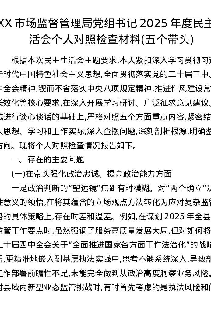 XX市场监督管理局党组书记2025年度xxxxx个人对照检查材料(五个带头)