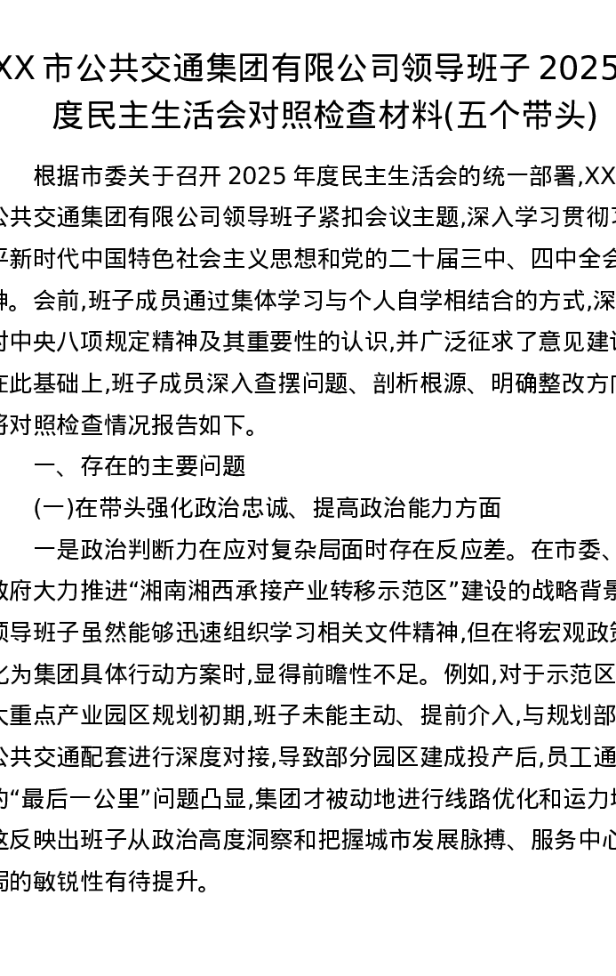 XX市公共交通集团有限公司领导班子2025年度xxxxx对照检查材料(五个带头)