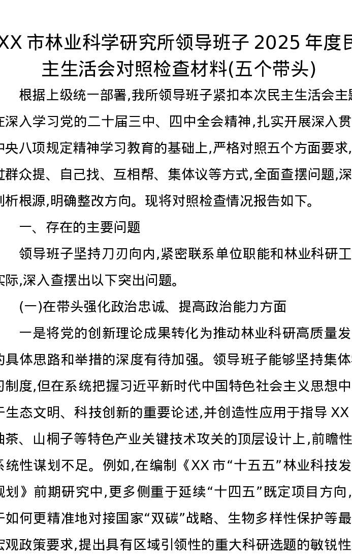 XX市林业科学研究所领导班子2025年度xxxxx对照检查材料(五个带头)