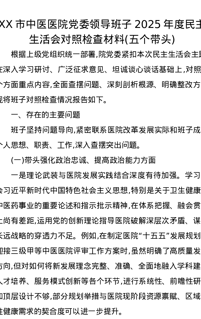 XX市中医医院党委领导班子2025年度xxxxx对照检查材料(五个带头)