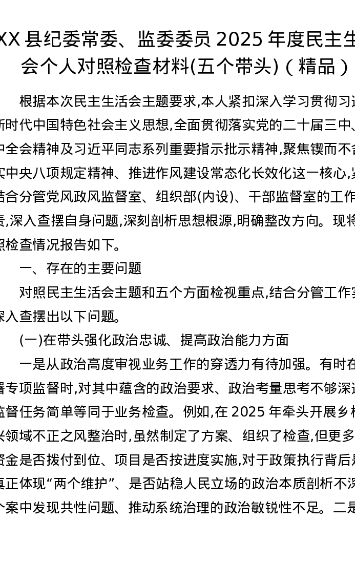 XX县纪委常委、监委委员2025年度xxxxx个人对照检查材料(五个带头)