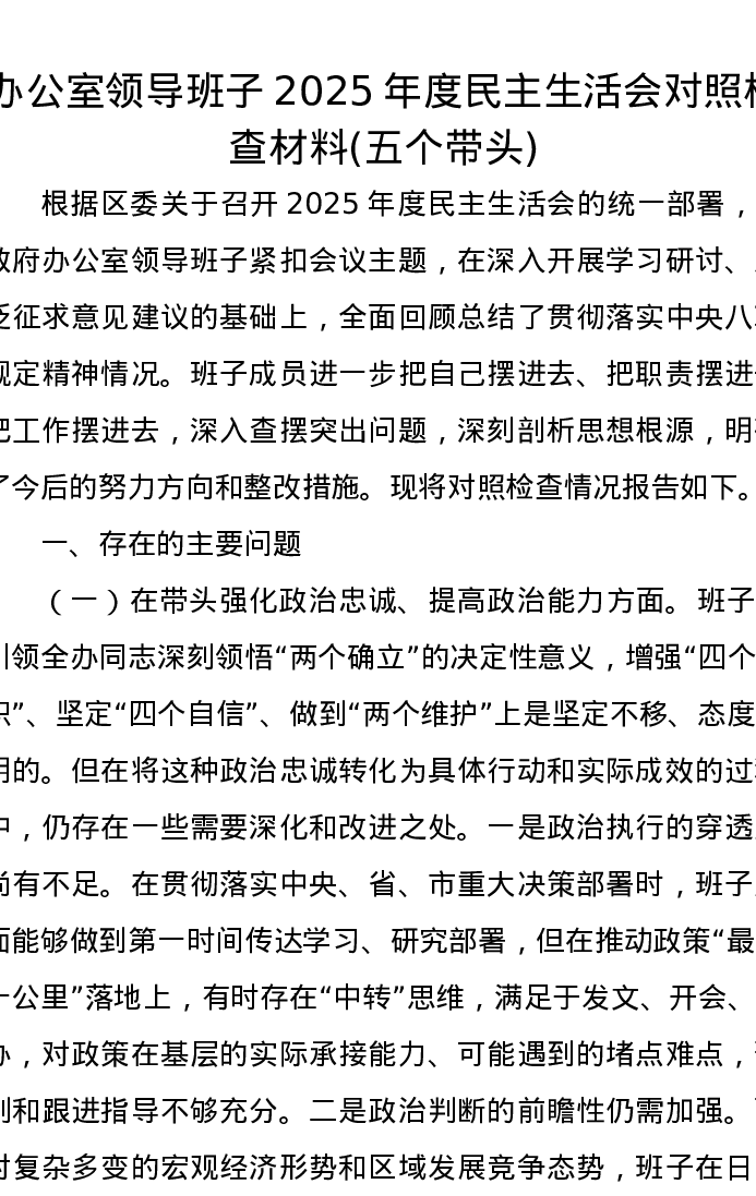 办公室领导班子2025年度xxxxx对照检查材料(五个带头)