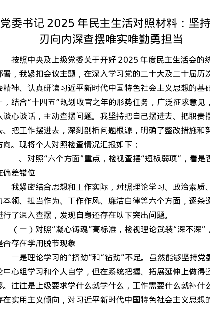 党委书记2025年xxxxx对照材料:坚持刀刃向内深查摆 唯实唯勤勇担当