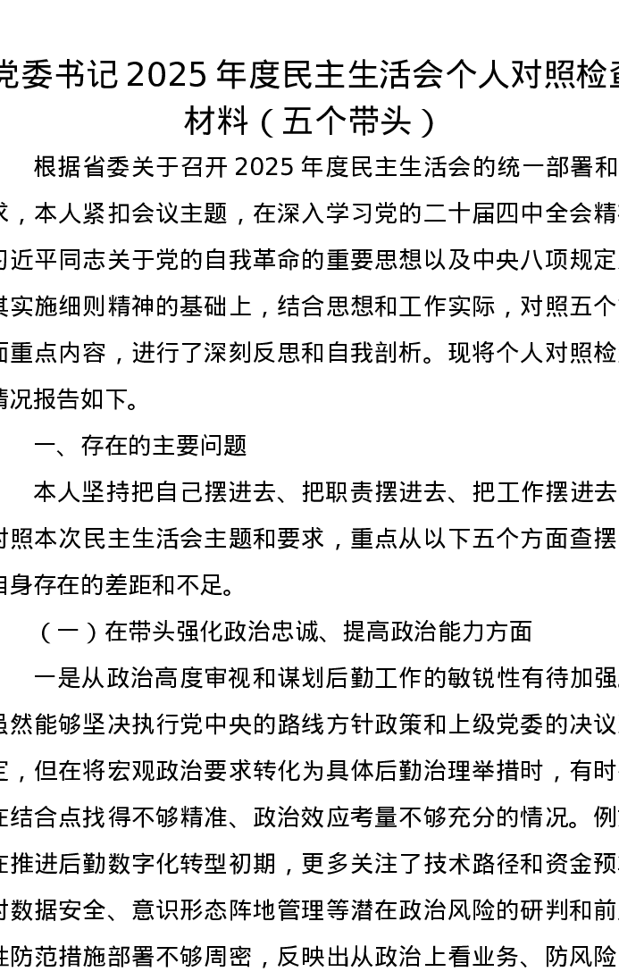 党委书记2025年度xxxxx个人对照检查材料(五个带头)