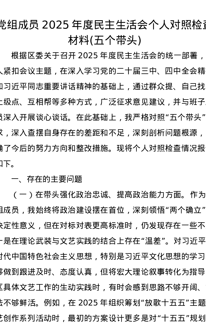 党组成员2025年度xxxxx个人对照检查材料(五个带头)