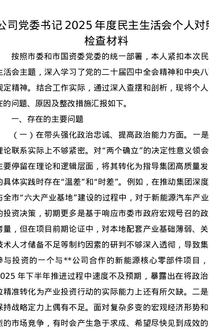 公司党委书记2025年度xxxxx个人对照检查材料(五个带头)