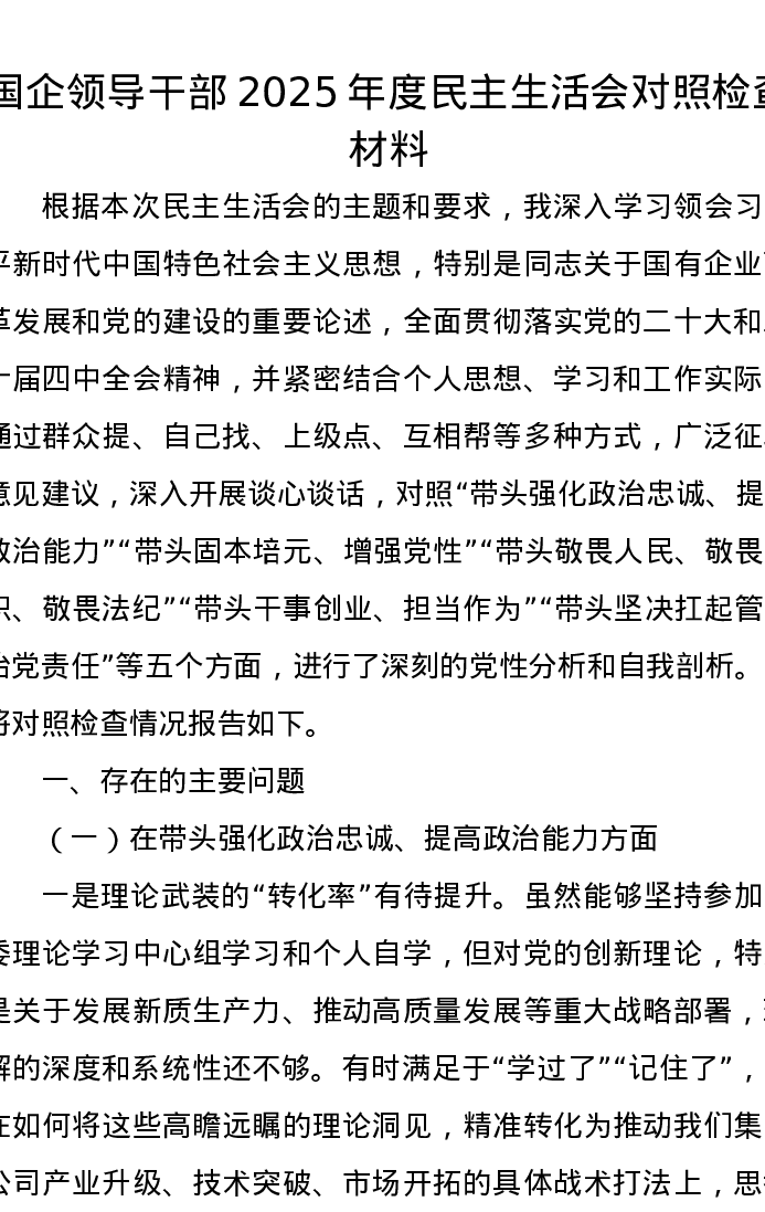 国企领导干部2025年度xxxxx对照检查材料(五个带头)